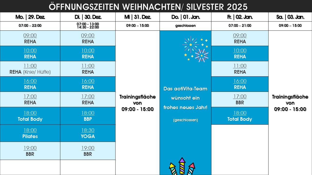 Ab Montag, 22.12.2025 gelten wieder unsere Sonderöffnungszeiten. Wir haben die Kurs- und Öffnungszeiten so angepasst, dass Du auch während der Feiertage etwas für Deine Fitness & Gesundheit tun kannst. Eine Übersicht aller Anpassungen findest Du hier.